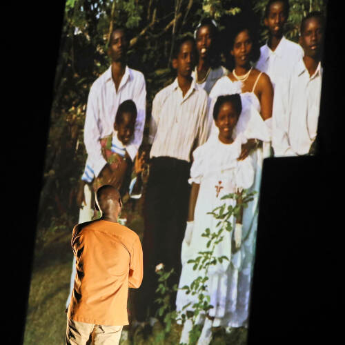 Chaque année, je reviens à Kigali, dans la maison de ma famille. Il y a toujours du lierre sur les murs, des callas et des langues de feu sur la terrasse, le palmier et le papayer à l’entrée, le mont Jali au nord, le mont Kigali au sud. Mais pendant des années, ce retour m’a été impossible. Ce spectacle est une lettre d’amour pour celles et ceux qui ne sont plus, un hymne à la vie, une part du culte des ancêtres. Je m’adresse à mon père, à ma mère, à tous·tes les absent·es. Je dis ce que j’ai vu et appris auprès d’elles·eux, l’enfant et le jeune homme que j’étais, le temps qu’il m’a fallu pour accepter l’inacceptable. Je me tiens au plus près des absent·es, j’honore leur mémoire et leur vie, j’explore le monde d’avant pour en dire la beauté et la poésie, et je m’interroge : comment traduire en mots ce qui demeure hors de portée ? Dorcy Rugamba
